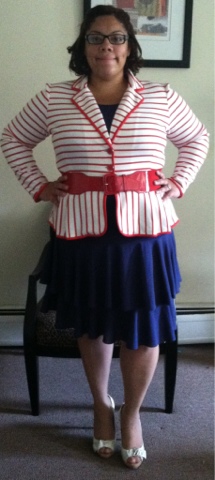 Peplum Striped Jacket Valerie Burtinelli from Marshalls Store. Dress Navy Blue Thrifted. White Shoes JCP, Belt Jessica Simpsom. I love this jacket!!